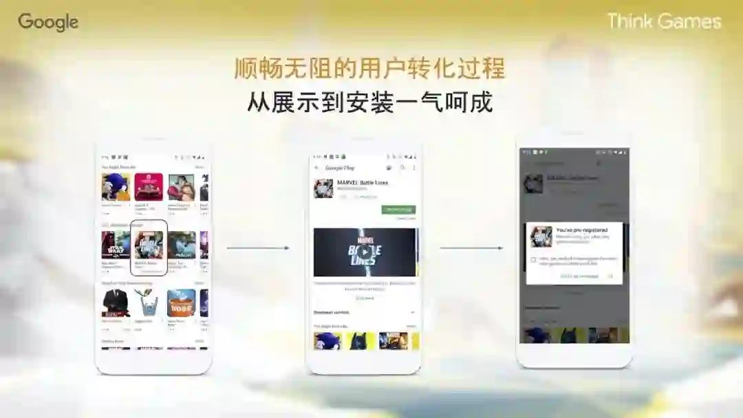 每天在 Google Play 发布的应用超过 6,000 款,App Store 也超过 3,600 款,如何让您的应用在发布当天即脱颖而出?发布前的营销至关重要——谷歌的 "预注册应用广告系列",为广告主提供顺畅无阻的用户转化过程,从广告展示 → 预注册用户的收集 → 发布当天自动安装,一气呵成。