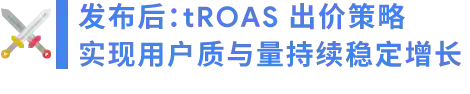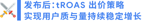 区别于以下载安装为目标的 tCPI,或者以完成应用内事件为目标的 tCPA,tROAS 是以支出回报率为出价目标,来寻找符合一定 ROI 要求的新用户的广告系列。举例来说,广告 ROI 目标是 7 天 10%,使用 tROAS 广告系列,转化追踪的时间窗口设为 7 天,出价设为 10%,该广告系列就会去寻找能够符合这个目标的用户来安装应用,对广告主来说投放更高效,效果衡量更直接。我们目前看到,tROAS 广告系列对于 ROI 和用户终生价值的提升都有显著效果。该方案目前处于开放测试阶段,欢迎联络客户经理试用,或了解更多 tROAS 出价方案。