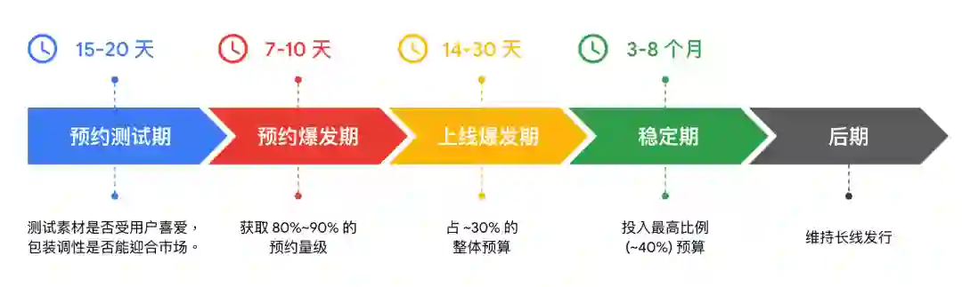 4399 对产品的预注册和前期爆发更加重视,根据整体节奏和预算分配,把发行分为 5 个阶段: