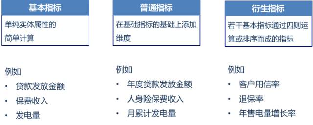 先对指标下个简单定义:指标是一种衡量业务目标的方法,是企业用来描述现有业务或预测未来业务的工具。比如银行业的贷款发放金额,保险行业的保费收入,电力行业的发电量等。企业指标几乎涵盖了企业全部的业务范围,即使按照最粗的维度来划分也可分为基本指标、普通指标、衍生指标三类: