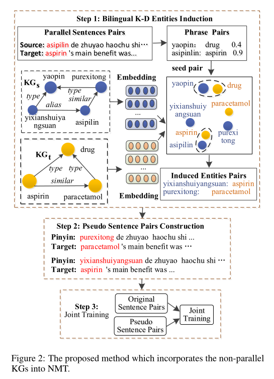 (1)提出了一种将非并行KG合并到NMT模型中的方法。