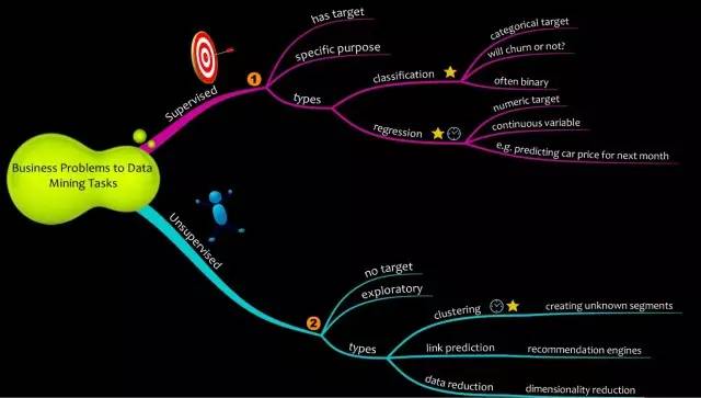 监督学习任务拥有一个事先定义好的目标。建模者有针对性地观察并且影响机器学习模型的生成的过程,以实现其特定的目标。监督学习可以进一步分为两类: