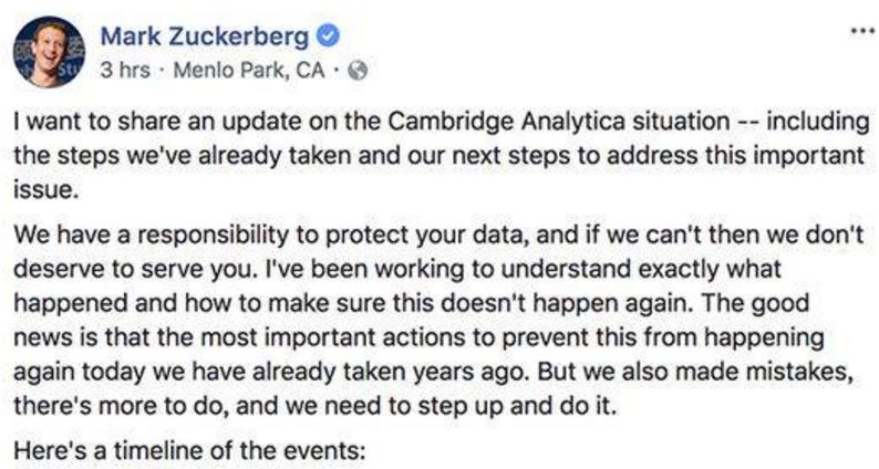 而昨天,在事件发生的第五天,脸书的创始人马克.扎克伯格,终于坐不住了,出来发表了声明。