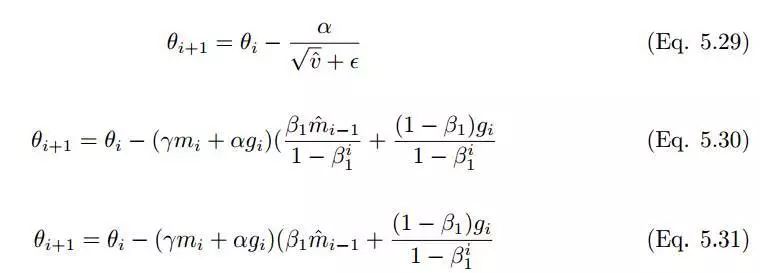 Nadam 是 NAG 和 Adam 优化器的结合 [28]。如果过往历史平方梯度的指数衰减平均值为 v_t,而过往历史梯度的指数衰减平均值为 m_t,那么经典动量更新规则如下: