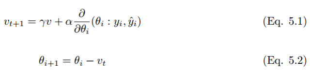随机梯度下降和小批量梯度下降是机器学习中最常见的优化技术,然而在大规模应用和复杂模型中,算法学习的效率是非常低的。而动量策略旨在加速学习过程,特别是在具有较高曲率的情况下。动量算法利用先前梯度的指数衰减滑动平均值在该方向上进行回退 [26]。该算法引入了变量 v 作为参数在参数空间中持续移动的速度向量,速度一般可以设置为负梯度的指数衰减滑动平均值。对于一个给定需要最小化的代价函数,动量可以表达为: