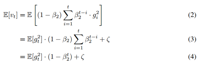 我们希望知道时间步 t 上指数移动均值的期望值 E[vt] 如何与真实的二阶矩 相关联,所以我们可以对这两个量之间的偏差进行修正。下面我们同时对表达式(1)的左边和右边去期望,即如下所示: