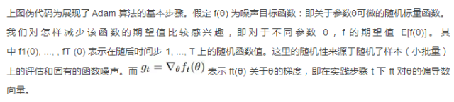 如上算法所述,在确定了参数α、β_1、β_2 和随机目标函数 f(θ) 之后,我们需要初始化参数向量、一阶矩向量、二阶矩向量和时间步。然后当参数 θ 没有收敛时,循环迭代地更新各个部分。即时间步 t 加 1、更新目标函数在该时间步上对参数θ所求的梯度、更新偏差的一阶矩估计和二阶原始矩估计,再计算偏差修正的一阶矩估计和偏差修正的二阶矩估计,然后再用以上计算出来的值更新模型的参数θ。