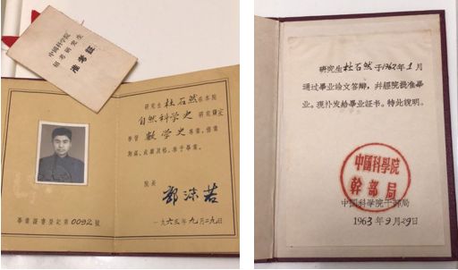 图3. 郭沫若签发的研究生毕业证书及补发说明(1963,杜石然提供)