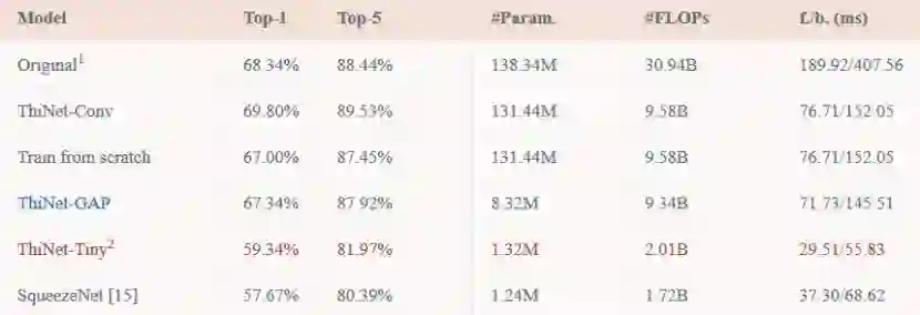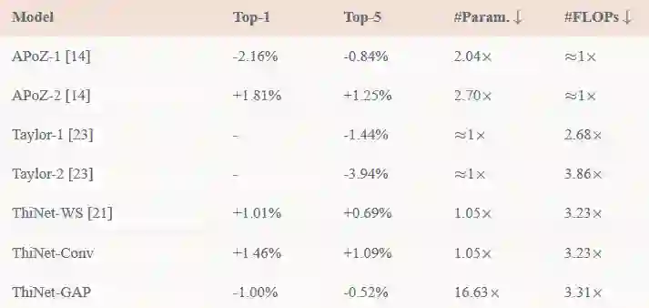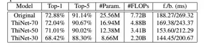 除此之外,在 ResNet-50 上的类似实验证明,即便是对于紧凑的网络,ThiNet 也能减少超过一半的的参数与 FLOPs,而 top-5 准确度仅降低 1%。