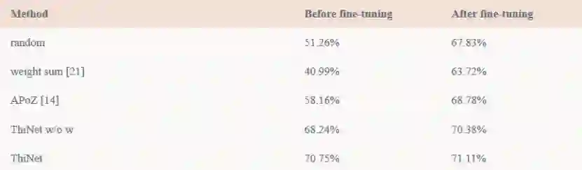 在这之后的微调步骤对于恢复模型的精准度也相当重要,从实验数据可以看出 ThiNet 具有相当的鲁棒性能。