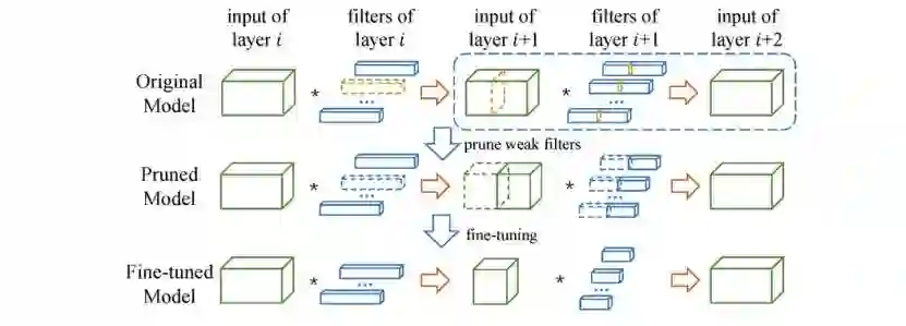 在下图的 ThiNet 剪枝框架图中,先根据图中的虚线框部分判断哪些通道及其相对应的滤波器性能较弱(第一行中用黄色高亮的部分)或可以被其他通道代替。然后丢弃对网络的性能影响较小的通道及其对应的滤波器从而得到一个剪枝模型。之后再对剪枝后的模型进行微调以恢复其精度。