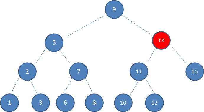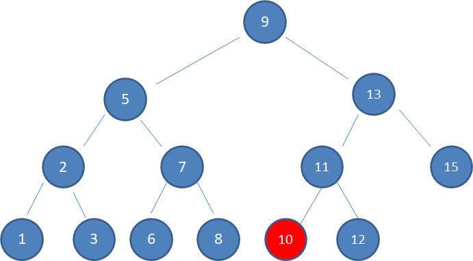 2.根据二叉查找树左子树小、右子树大的特性,10 > 9,因此值为10的结点只可能在根结点的右子树当中,我们查看右孩子结点13: