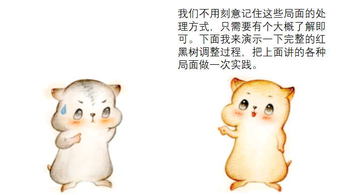 但是,仅仅把一个结点变色,会导致相关路径凭空多出一个黑色结点,这样就打破了规则5。因此,我们需要对其他结点做进一步的调整,后文会详细说明。