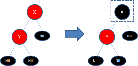 下图所表示的是红黑树的一部分(子树),新插入的结点Y是红色结点,它的父亲结点X也是红色的,不符合规则4,因此我们可以把结点X从红色变成黑色:
