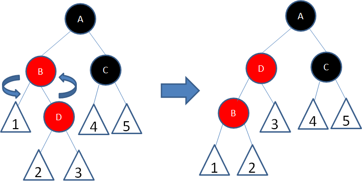 局面5:新结点(D)的父结点是红色,叔叔结点是黑色或者没有叔叔,且新结点是父结点的左孩子,父结点(B)是祖父结点的左孩子。