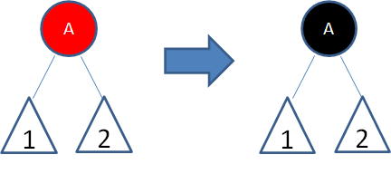 这种局面,直接让新结点变色为黑色,规则2得到满足。同时,黑色的根结点使得每条路径上的黑色结点数目都增加了1,所以并没有打破规则5。