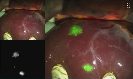 “近红外荧光成像系统”利用国际领先的光学分子影像技术,采用高通量双光路光学设计,能够同时提供肿瘤细胞分子水平的近红外荧光信号和外科医生人眼可见的解剖结构实时影像,通过“点亮”肿瘤细胞对肝癌病灶实施术中精准成像和显影。