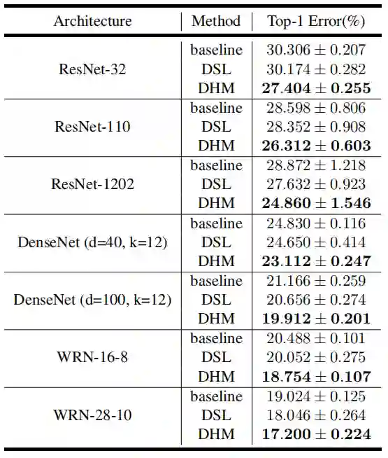 首先,给出了CIFAR-100数据集上所提方法与DSL的性能对比,见下图。尽管DSL可以提升模型的性能,但提提升比较少,而作者所提DHM可以得到更高的性能提升。该实验证实了所提方法的有效性。