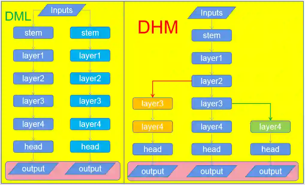 最后,再补上一个与DHM极为相似的方法DML,两者的流程图如下所示。论文原文确实提到了DML方法,但并未与之进行对比。从图示可以看到两者还是比较相似的,尽管DML初衷是两个网络采用知识蒸馏的方式进行训练,而DHM则是针对DSL存在的缺陷进行的改进。