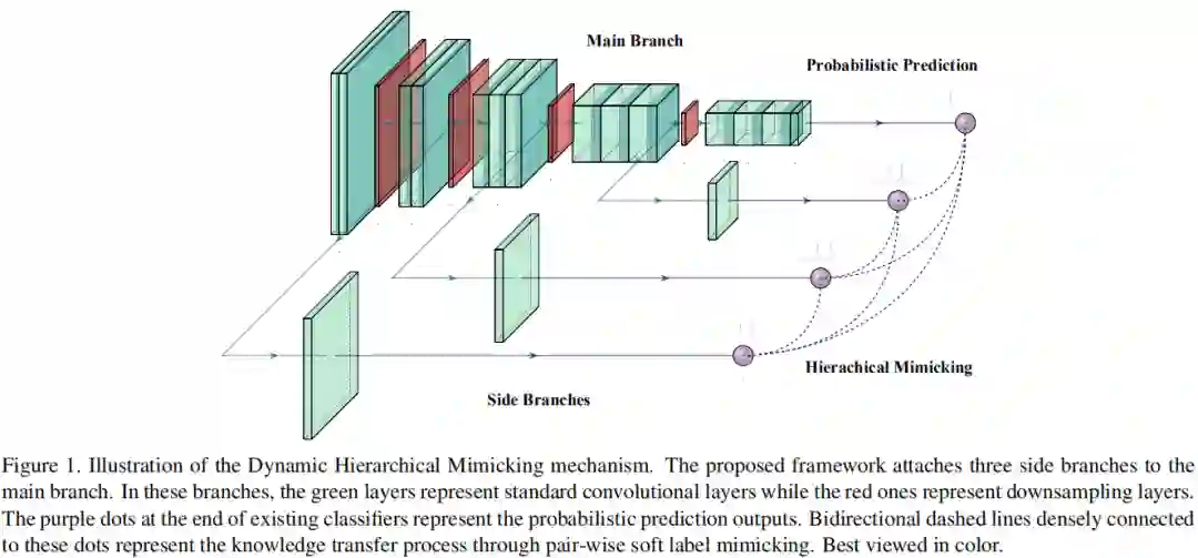 作者提出一种动态分层模仿机制(Dynamic Hierarchical Mimicking,一种广义特征学习机制)加速CNN训练同时使其具有更强的泛化性能。所提方法部分受DSN启发,对给定神经网络的中间特征进行巧妙的设置边界分支(side branches)。每个分支可以动态的出现在主分支的特定位置,它不仅可以保留骨干网络的特征表达能力,同时还可以研其通路产生更多样性的特征表达。与此同时,作者提出采用概率预测匹配损失进一步提升多分支的多级交互影响,它可以确保优化过程的鲁棒性,同时具有更好的泛化性能。