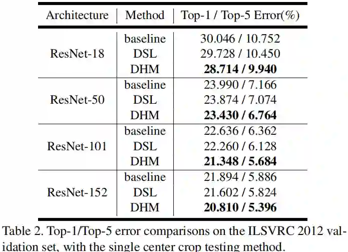 上图给出了常规训练过程、DSL训练过程以及DHM的训练成果对比。常规训练过程仅在head部分有一个损失;而DSN(即DSL)则有多个损失,不同的损失回传的速度时不一样的,比如左分支损失直接传给了layer2,这明显快于中间的主损失,这是缓解“梯度消失”的原因所在;DHM类似于DSL具有多个损失,但同时为防止不同损失对中间层优化方向的不一致,而添加了额外的辅助层,用于模拟深度网络的分层特征表达。