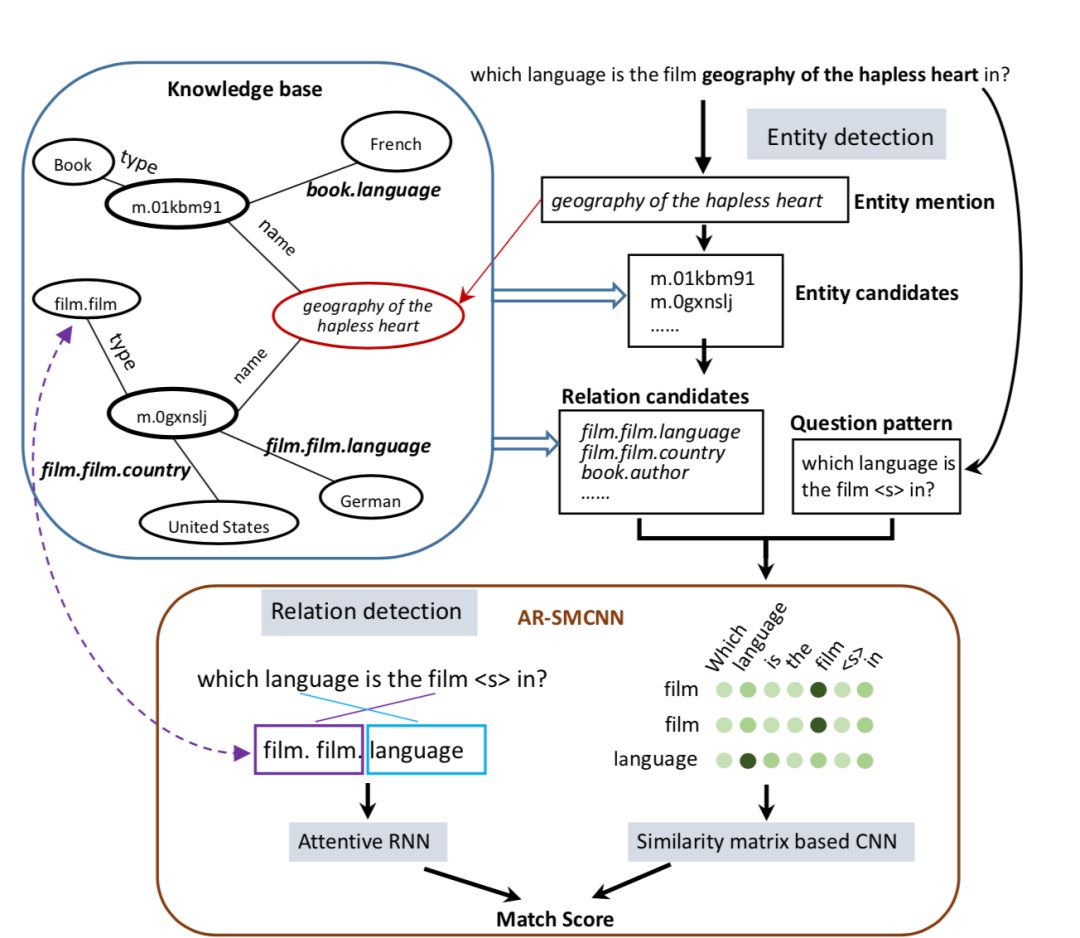 作者提出一种称为 attentive recurrent neural network with similarity matrix based convolutional neural network 网络结构,同时运用 attentive rnn 以及 cnn 来得到 question 与 kb facts 之间的相似度从而给出匹配得分. 上图为完整的流程示意图.
