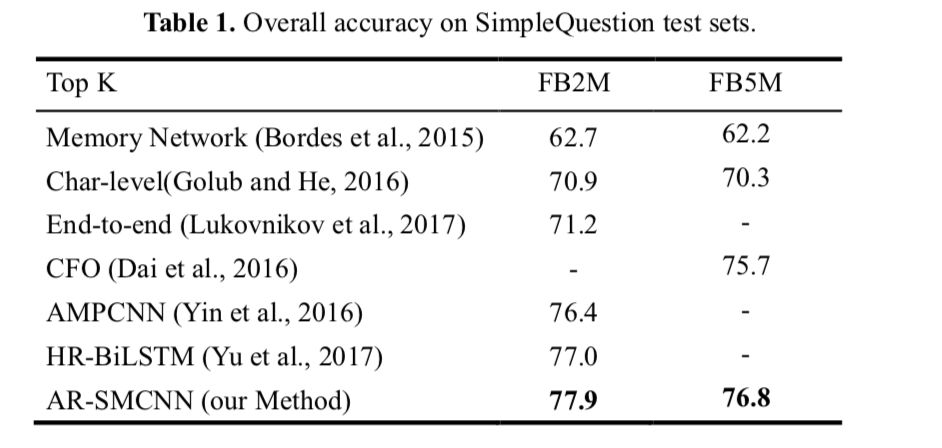 当前大部分的 kbqa 方法为将 kb facts 与 question 映射到同一个向量空间上,然后计算相似性. 但是这样的做法会忽视掉两者间原本存在的单词级别的联系与交互. 所以本文提出一种网络结构 ARSMCNN,既利用到语义的信息, 又利用到单词级别的交互.