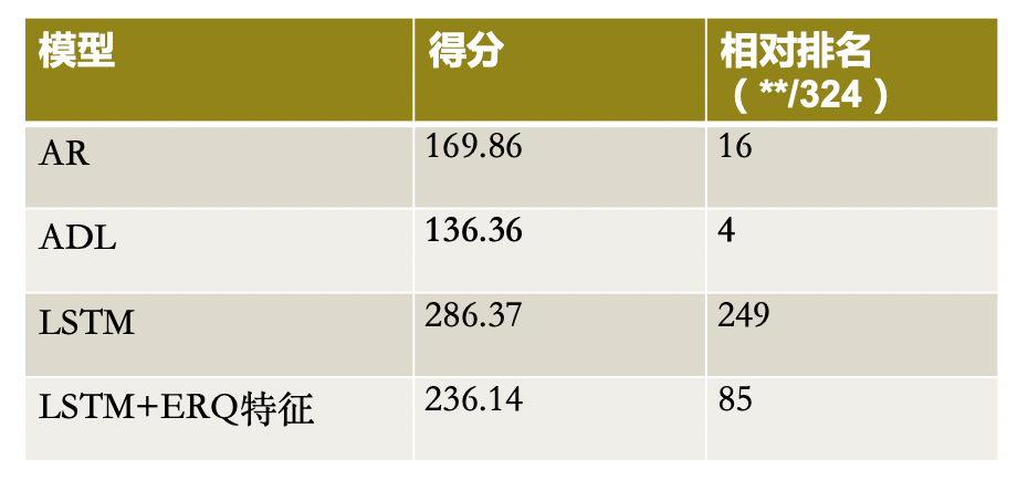 结合对实验数据的观察,叶子逸主要考虑了自回归模型(AR,baseline)、长短期记忆网络模型(LSTM,不考虑 ERQ,baseline)、自回归分布滞后模型(ADL,考虑 ERQ)、使用词袋模型和 k-means 聚类融合各类 ERQ 特征的特征聚类的自回归分布滞后模型(ADL,考虑 ERQ)、长短期记忆网络模型(LSTM,考虑 ERQ)等几种不同模型。