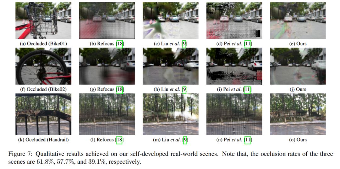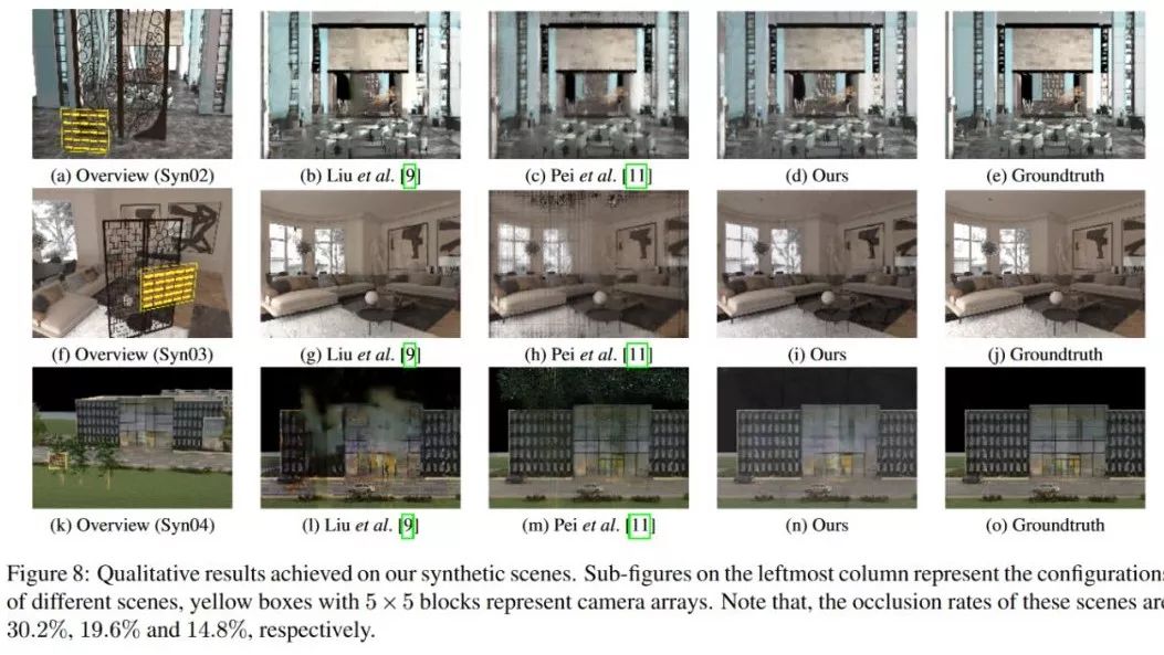 真实场景通过使用相机对户外场景拍摄得到。采集真实场景时,作者将Leica相机固定于机械扫描台上,通过控制扫描台将相机依次移动至5*5的采样点处(基线长度3 cm)进行拍摄。通过对图像的后期校正处理,最终得到5*5视角的遮挡图像。真实场景不提供无遮挡groundtruth图像,因此主要用于对算法进行视觉评估(qualitativeevaluation)。