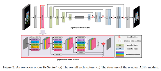 作者采用了残差空洞金字塔(residual ASPP)模块在编码之前获取更大的感受野,引导网络对语义信息(如遮挡物)的提取。论文的实验部分对residual ASPP和skip connection的设计进行了消融实验,实验结果验证了其有效性。