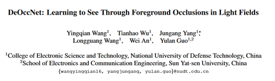 近日,国防科技大学研究团队提出阵列相机去除前景遮挡成像新方法,相关论文DeOccNet: Learning to SeeThrough Foreground Occlusions in Light Fields已被WACV2020录用。