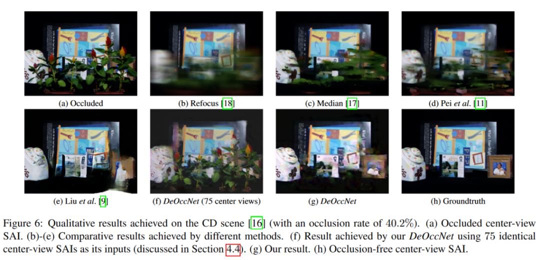 注意到Fig. 6对应的CD场景角分辨率为5*15,作者将中心视角遮挡图像复制75次输入至网络中,得到结果图Fig. 6(f)。可以发现算法仅处理中心视角图像并不能实现去遮挡效果。
