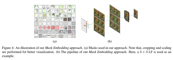 作者针对这一问题提出了新的解决方案Mask Embedding,即采用生活中常见的80幅前景遮挡物图像作为掩膜(Mask),将Mask按照光场的结构嵌入(Embed)至公开数据集的光场中深度较浅的区域,从而构造出含有前景遮挡物的光场图像供网络训练。