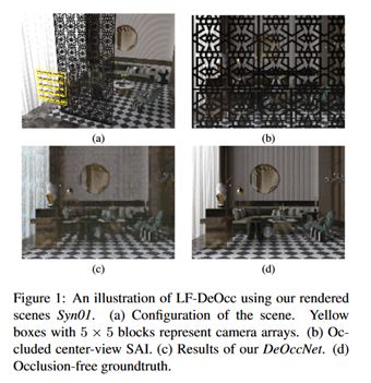 论文提出了领域内首个针对光场去遮挡(LF-DeOcc)任务的深度学习网络DeOccNet,Fig. 1展示了论文算法的效果。