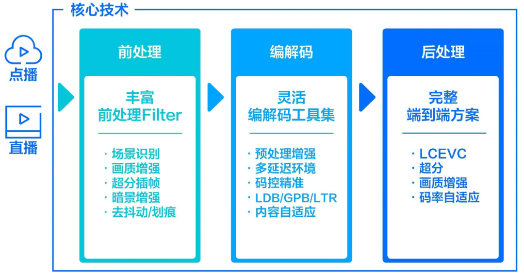 腾讯云音视频的腾讯明眸·极速高清产品致力于以更低码率提供更高清的流媒体服务,给用户带来全新的高清视野。其采用的智能动态编码技术通过智能场景识别、动态编码匹配、画质修复增强相结合来不断提升我们的服务质量。同时,明眸能在保持视频画质质量不变的情况下,最多可以降50%的码率,减少视频传输存储成本;提供超分、片源修复等多种功能,帮助用户提升视频画质;通过AI,其还能识别视频中的人物信息,自动过滤弹幕信息,提升用户观看体验。
