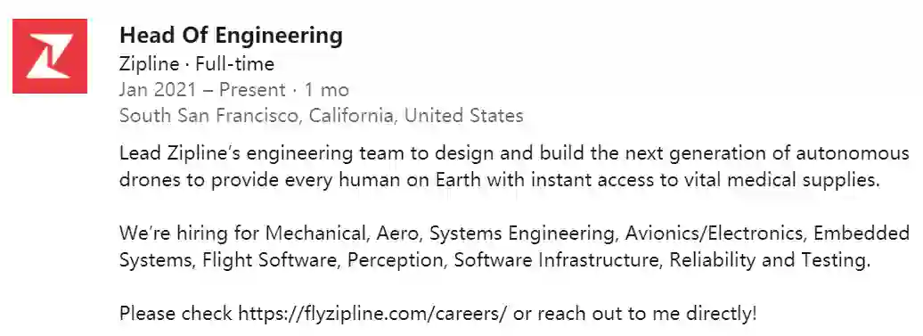 「在特斯拉度过了精彩的十年后,我非常高兴能够以工程部主管的身份在Zipline开启新的篇章,和一群才华横溢且敬业的工程师一起工作,为地球上的每个人提供即时的重要医疗补给。