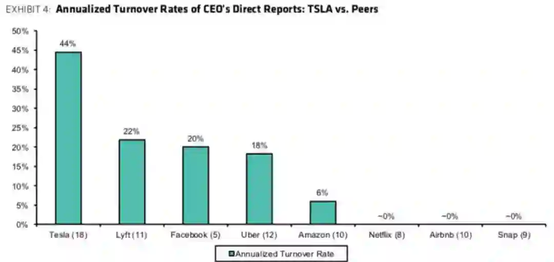 据一份报告显示,特斯拉公司的高管离职率明显高于美国其他科技公司,年度离职率高达44%。