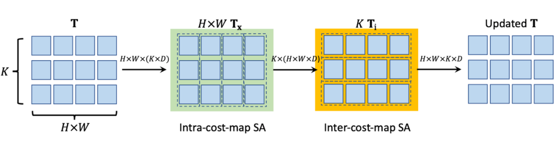 AGT 轮流使用这两种分组,对组内的 token 使用 Transformer 编码,这样信息可以在所有 token 之间进行传播但算力相比同时对所有 token 使用 Transformer 又大幅下降。我们使用了三层 AGT,最终得到 H x W x K 个 token,并将其作为编码后的 cost memory。