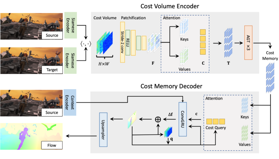FlowFormer 基于 RAFT 的思想,探索了使用 Transformer 对其进行全方位改进,包含了以下重要模块:1)Alternate-Group Transformer (AGT)层,将 4D cost volume 投影至隐空间编码为cost memory;2) Recurrent Transformer Decoder,使用 dynamic positional cost query 循环的从 cost memory 中提取信息来优化光流估计;3)首次验证了使用 ImageNet 预训练的 Transformer 来编码图像特征可以提升光流估计性能。
