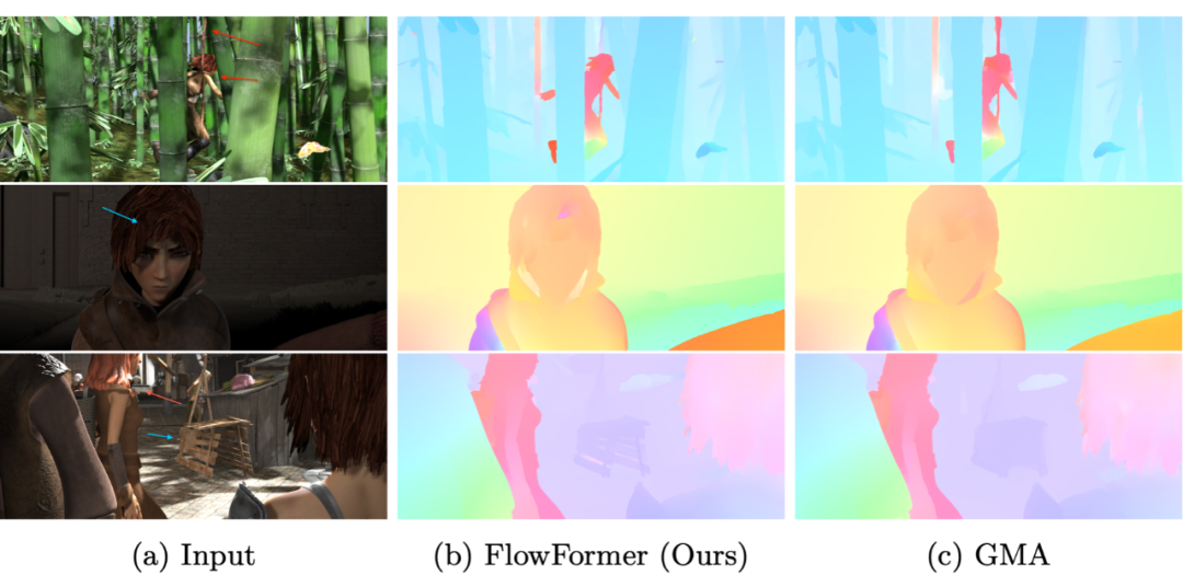 Sintel Benchmark 上的精度分析:在 FlyingChairs、FlyingThings、Sintel 训练集这三个数据集上训练,在 Sintel 测试集上评测。FlowFormer 将误差降到了 1.16 和 2.09,下降比率达到了 16.5% 和 15.5%。