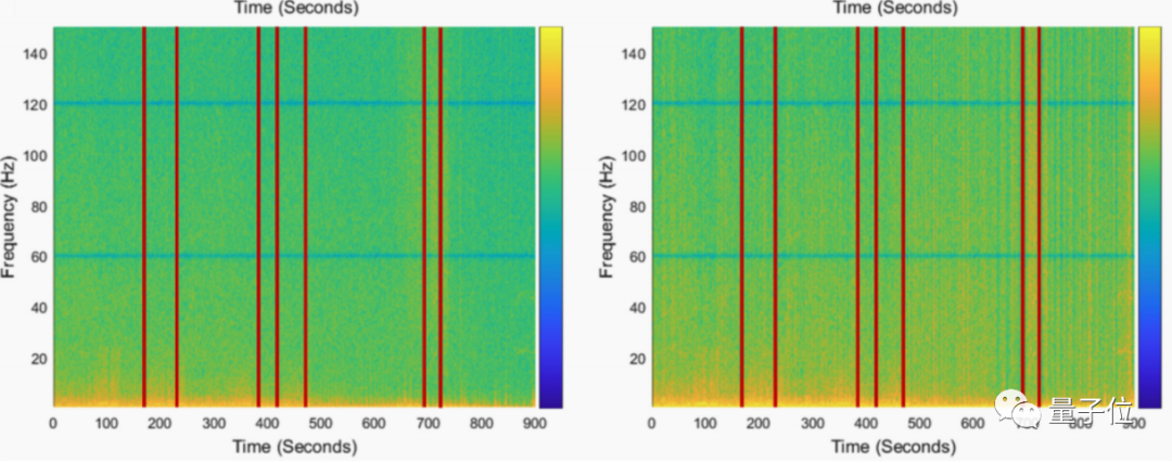 下面这张图,显示了这900秒期间的EEG输出,不同颜色代表不同电极附着的不同头皮区域,其中左图指代左脑半球,右图指代右脑半球。