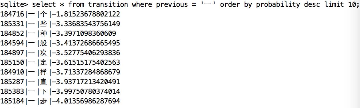 此处用到的是最简单的一阶隐马尔科夫模型,即认为在一个句子里,每个汉字的出现只和它前面的的一个汉字有关,虽然简单粗暴,但已经可以满足大部分情况。统计的过程就是找出字典中每个汉字后面出现的汉字集合,并统计概率。因为这个概率矩阵非常的大,逐条数据写入数据库过慢,后续可以优化为批量写入,提高训练效率。结果如下: