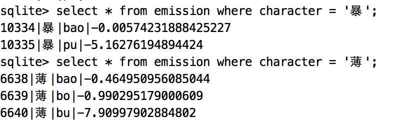 代码见model/table.py文件,针对隐马尔科夫的三个概率矩阵,分别设计了三个数据表存储。这样的好处很明显,汉字的转移概率矩阵是一个非常大的稀疏矩阵,直接文件存储占用空间很大,并且加载的时候也只能一次性读入内存,不仅内存占用高而且加载速度慢。此外数据库的join操作非常方便viterbi算法中的概率计算。