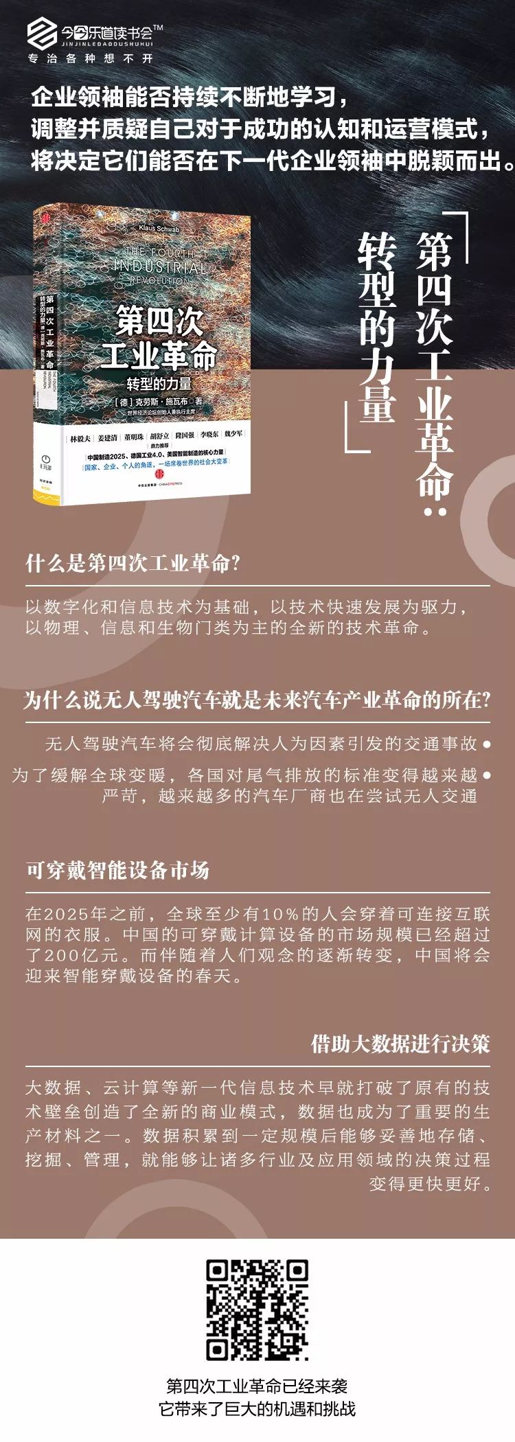 在社会和技术指数级进步的推动下,第四次工业革命的进程开始了!这一轮工业革命的核心是智能化与信息化,进而形成一个高度灵活、人性化、数字化的产品生产与服务模式。不同于过去的几次工业革命,这次变化之大,技能之丰富,影响之深远,给创业者们带来了巨大的机遇和挑战。第四次工业革命中有哪些可以挖掘的机会?而又有什么技术理念具有广阔的市场和前景?这本《第四次工业革命》可以帮助大家了解其中的巨大变化,从而更好地利用这次变化。在这本书中,作者施瓦布认为,这场革命正以前所未有的态势向我们席卷而来,它发展速度之快、范围之广、程度之深丝毫不逊于前三次工业革命。它将数字技术、物理技术、生物技术有机融合在一起迸发出强大的力量影响着我们的经济和社会。