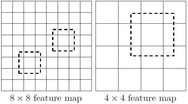8*8 的特征图相当于将原图分为 64 份,这样每个 anchor 比较小,而 4*4 的则相反。