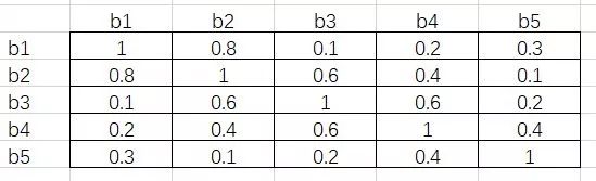 同样地,为了便于理解,下面依旧举例说明。假设我们有 5 个 RoI,对于 person 这一类,按照置信度由高到低分别是 b1、b2、b3、b4 和 b5。接下来通过矩阵运算得出它们彼此之间的 IoU,假设结果如下: