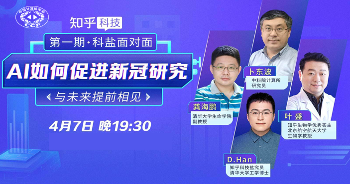 在4月7日的直播中,“科盐面对面”首期科普节目的主题为“人工智能如何影响新冠病毒研究?”,由中科院计算所研究员卜东波、清华大学生物学副教授龚海鹏、北京航空航天大学生物学教授、知乎生物学优秀答主“叶盛”、知乎科技盐究员“D.Han”一同对谈,对人工智能在新冠疫情研究中的应用进行探讨。