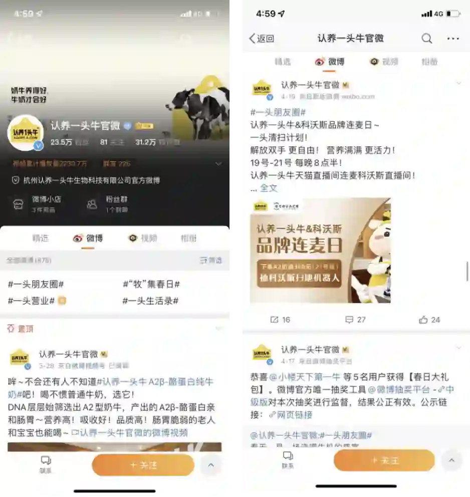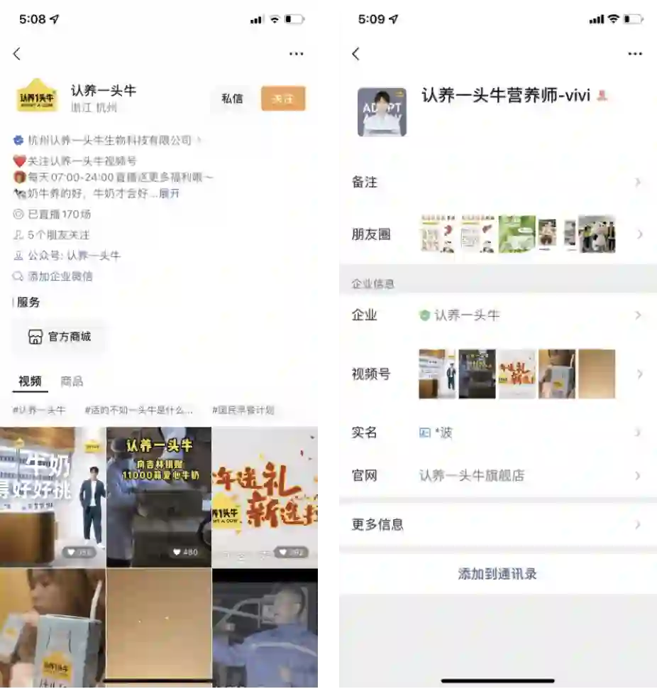公众号:目前有5个号,主号「认养一头牛」预估粉丝10w左右,是品牌宣传的主要窗口,也有引流私域的入口。其他账号分别有企业团购、企业校招社招、代理订货等功能。