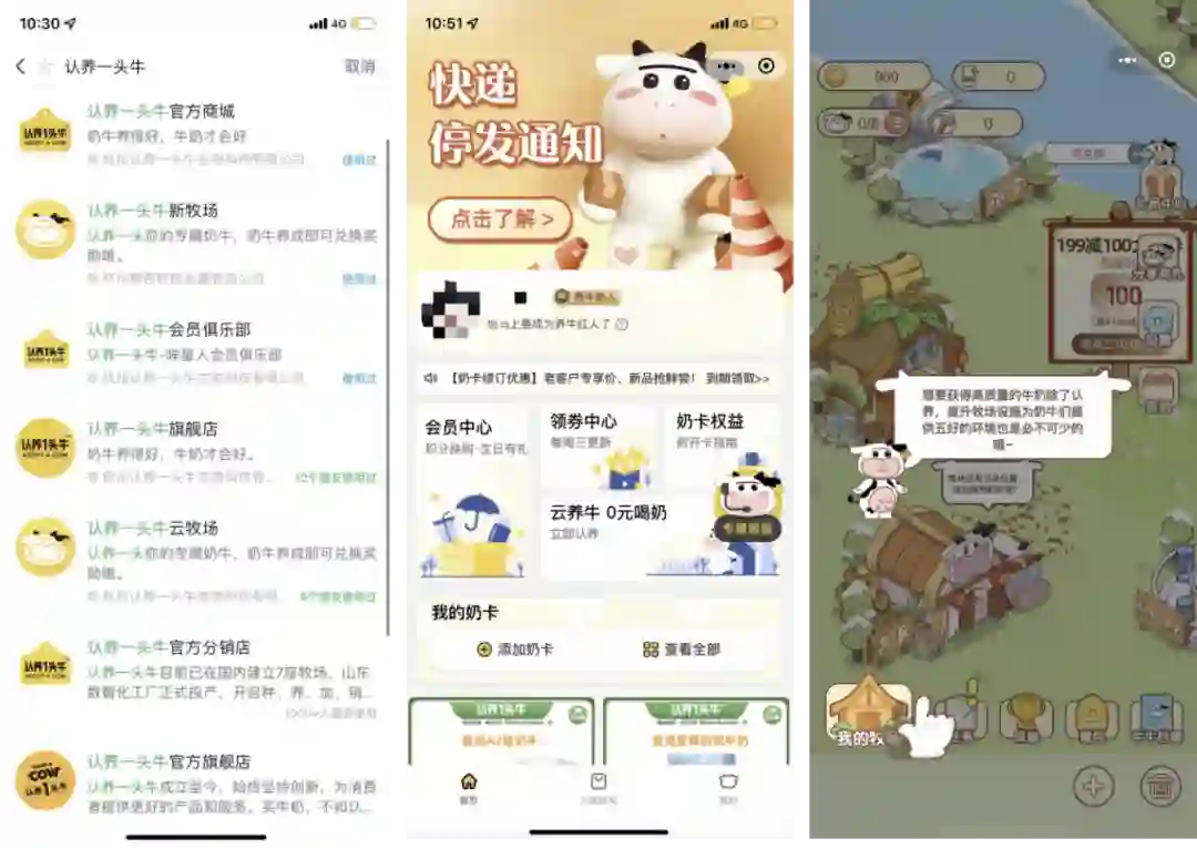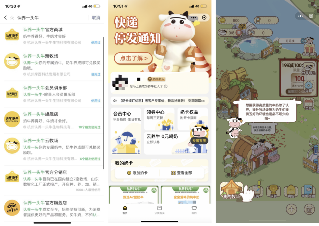 小程序:目前有9个小程序,是用户线上购买的主要渠道。除了常规的商城和会员功能以外,小程序还有一大亮点,就是线上云养牛的小游戏,极大地强加了用户的粘性。