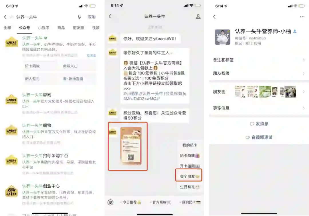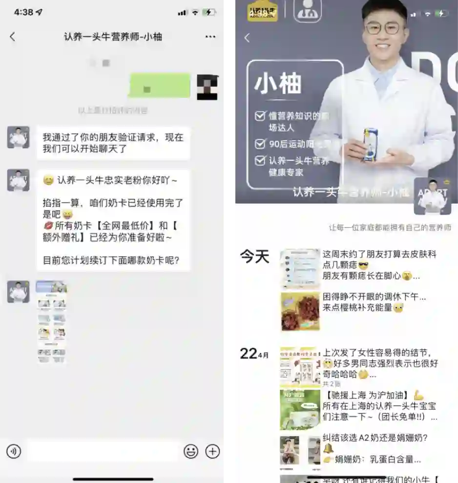 认养一头牛将员工的形象打造成专业的营养师,昵称通常采用「认养一头牛营养师-xx」的格式,例如认养一头牛营养师-小柚。头像和朋友圈是以穿着白大褂的真人方式呈现,给用户专业可靠的形象。用户添加后,会发送自动欢迎语,引导用户进行开卡